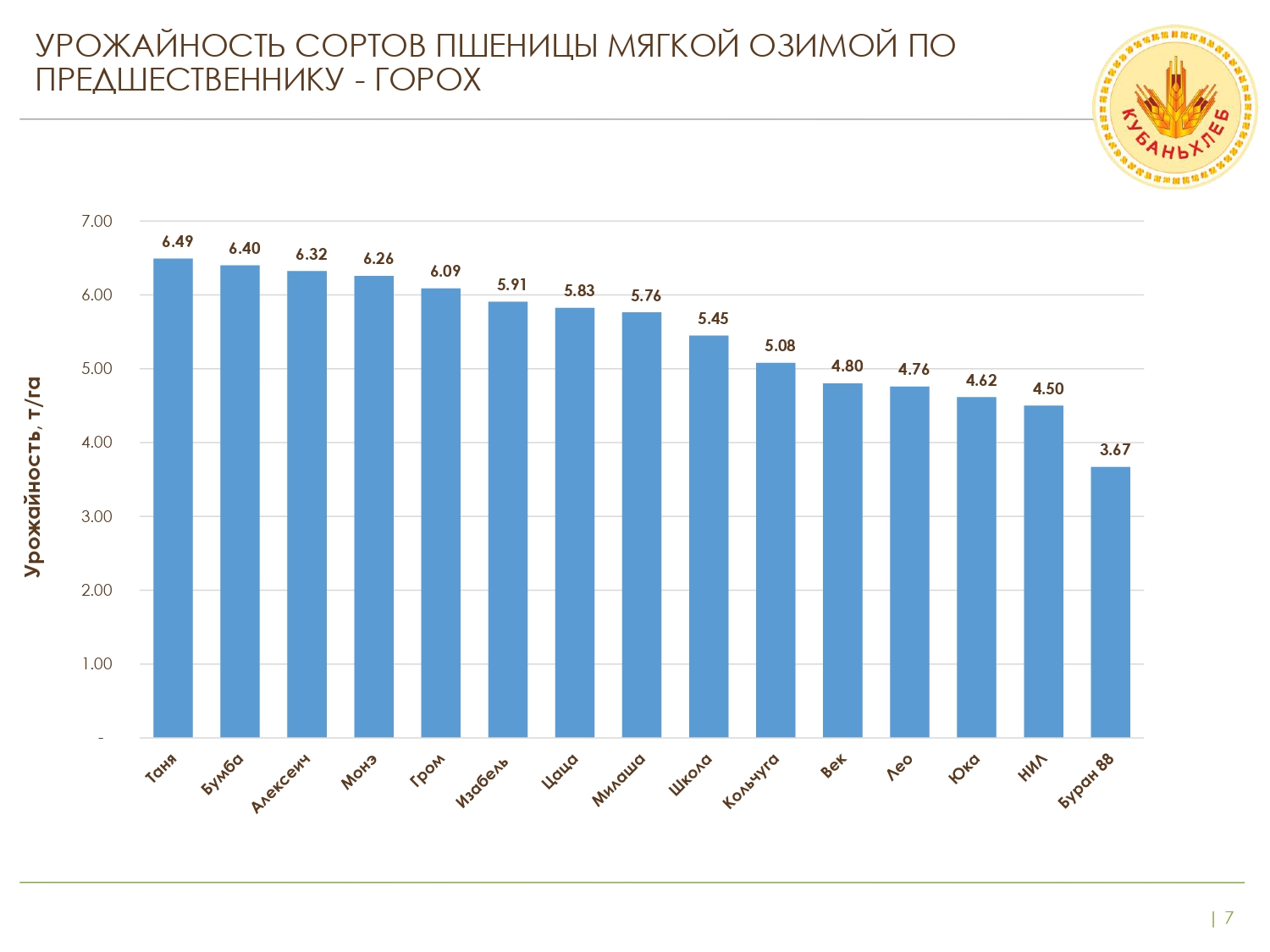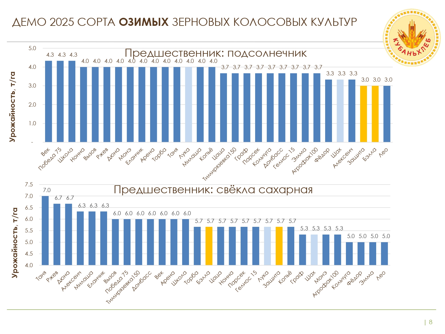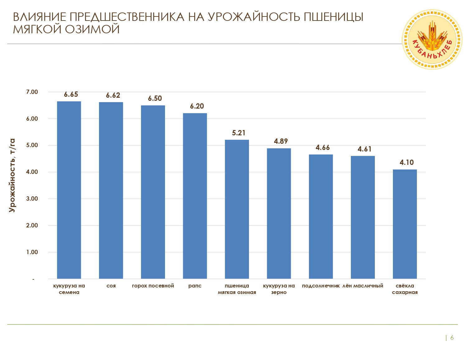 В сезоне 2024/25 сильное влияние на урожайность озимой пшеницы оказал предшественник. Это видно из данных по урожайности в производственных посевах (средние значения по трём хозяйствам АПК «Кубаньхлеб»)