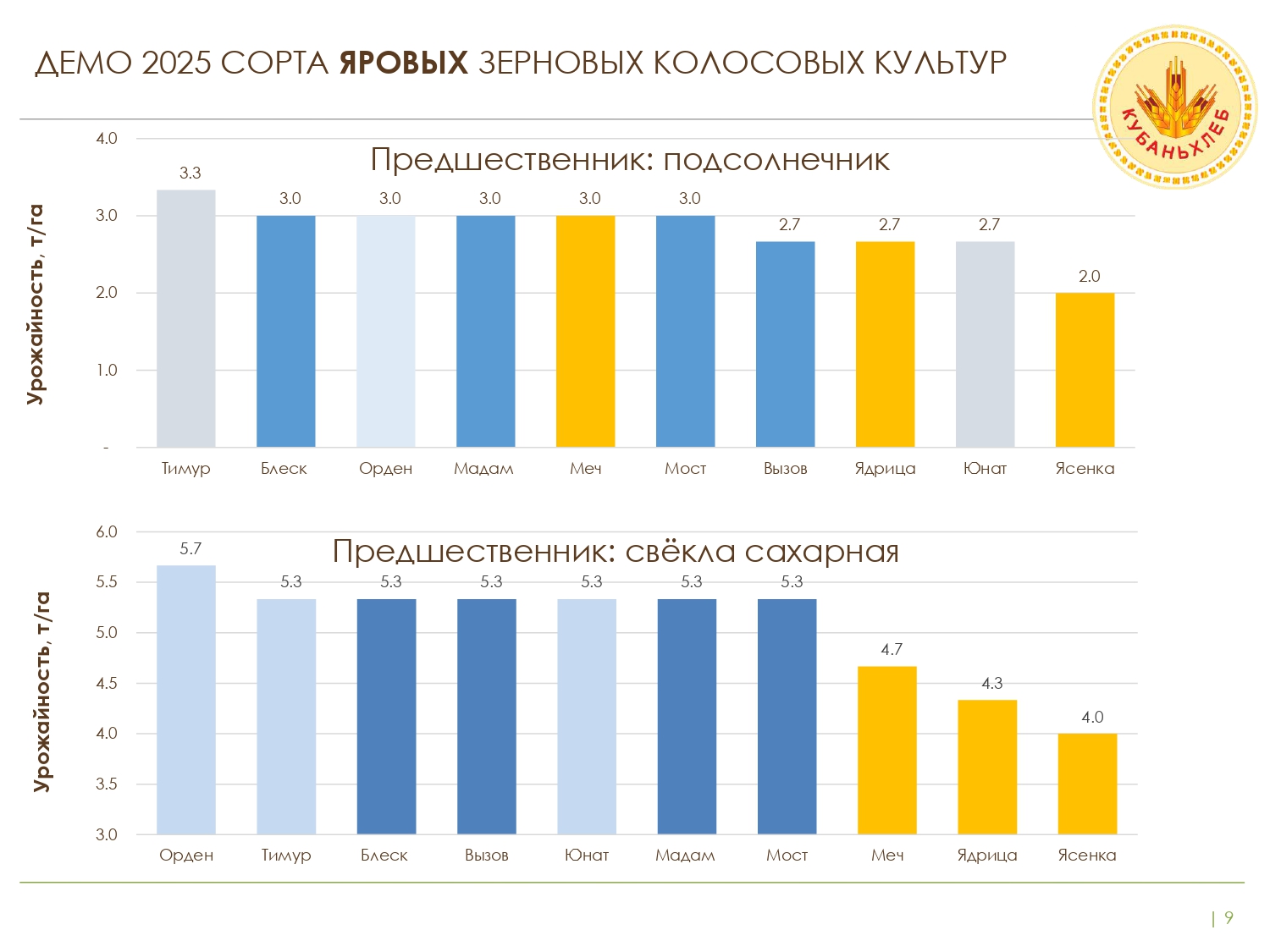 Для информации руководитель отдела селекции и семеноводства АПК «Кубаньхлеб» также поделился данными по урожайности яровых культур на демонстрационном поле. Синие столбцы – яровая мягкая пшеница, жёлтые – яровая твёрдая пшеница, голубые – тритикале.