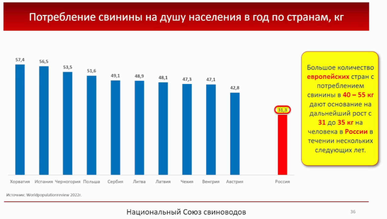Статистика европейских стран показывает, что подушевое потребление свинины вполне может составлять и 40, и 50 килограммов в год. Так что россияне вполне могли бы «дорасти» до 2030 года к 34-35 кг. Вопрос в том, за счёт чего будет происходить рост потребления.