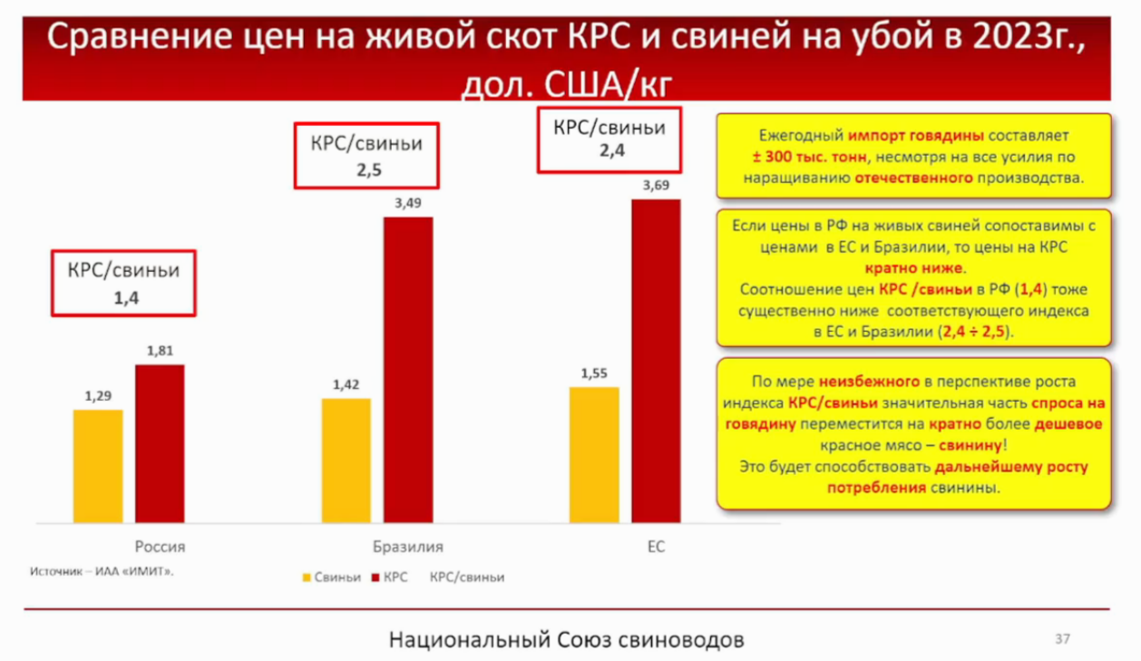 Отчасти свиноводы могут «отщипнуть» долю у говядины, полагает Юрий Ковалёв. Соотношение цен на свинину и говядину говорит не в пользу говядины. Кроме того, говядина в России – если сравнивать с другими странами – слишком дешёвая, чтобы быть рентабельной, поэтому цена на мясо КРС неизбежно будет расти.