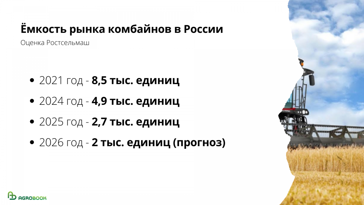 По словам бизнесмена, спрос на комбайны сокращается с 2021 года, когда были введены экспортные пошлины на зерно и масличные. Тогда ёмкость составляла 8,5 тысячи единиц; к 2024 году она сократилась до 4,9 тыс. машин. В 2026 году прогнозируется падение до 2 тыс. машин.