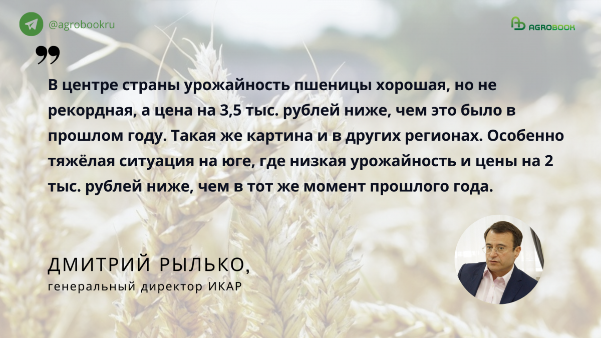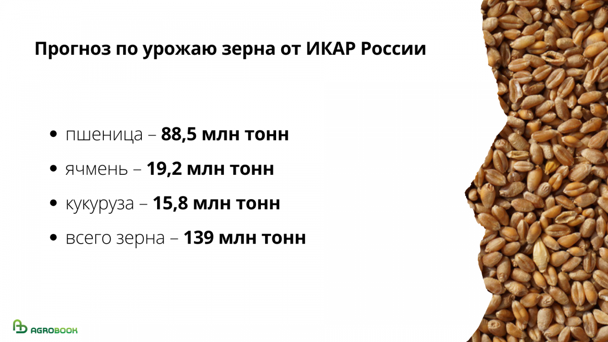 Дмитрий Рылько отметил, что урожай зерна, который изначально оценивался как «компактный», с течением уборки вырос в «средний» и даже выше среднего. ИКАР прогнозирует, что в этом году, когда уборка, наконец, законится, сбор пшеницы составит 88,5 млн тонн, ячменя – 19,2 млн тонн, кукурузы – 15,8 млн тонн. Весь урожай зерна ИКАР оценивает в 139 млн тонн.