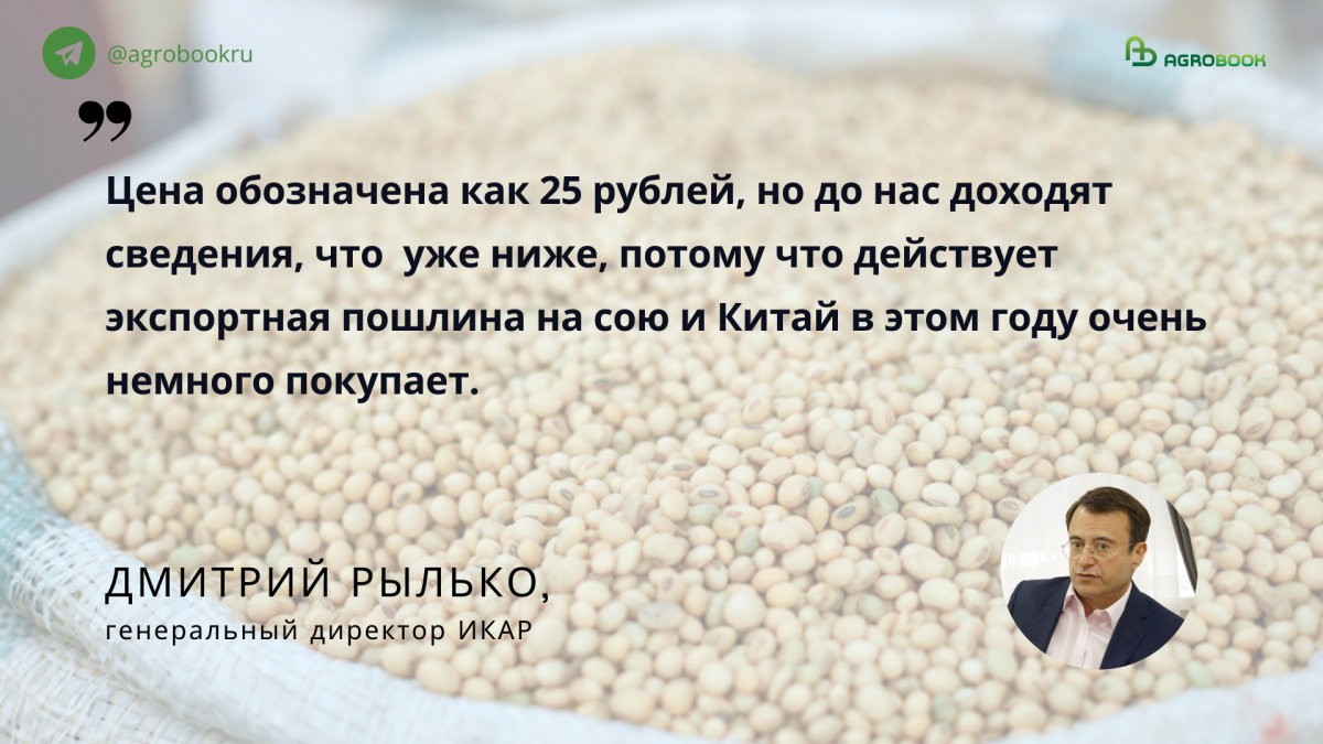 «Цена обозначена как 25 рублей, но до нас доходят сведения, что уже ниже, потому что действует экспортная пошлина на сою и Китай в этом году очень немного покупает».