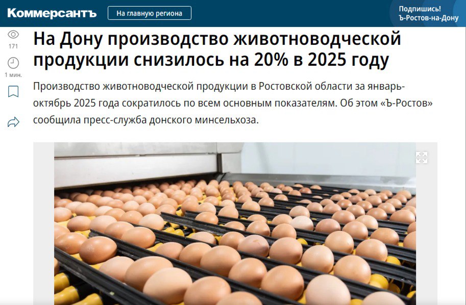 Ростовская область в этом году переживает кризис не только в растениеводстве, но и в животноводстве. На днях издание «Коммерсант» опубликовало грустную статистику: производство молока в течение января-октября текущего года уменьшилось на 10% по сравнению с показателями прошлого года (852,6 тыс. тонн, -10,5%), производство яиц – на 20% (1121,7 млн штук, -20,2%), численность коров достигла 237,6 тыс. голов (-18%), что составляет всего 82% к 1 ноября 2024 года.