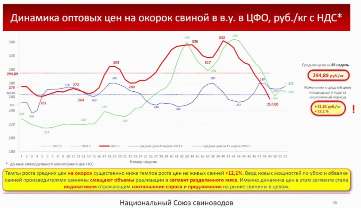 Эксперт отметил, что в этом году очень драматично колебались цены на живых свиней – в моменте они доходили до 174 рублей за килограмм, но в последние недели произошёл обвал до 112 рублей за килограмм. Это снижение последовало за падением цен на окорок, который считается индикативом на рынке свинины. Колебания цен Юрий Ковалёв объяснил «моментным соотношением баланса спроса и предложения»: в зависимости от спроса потребителей закупки живка то растут, то падают, а продавать живых свиней производителям нужно каждый день.